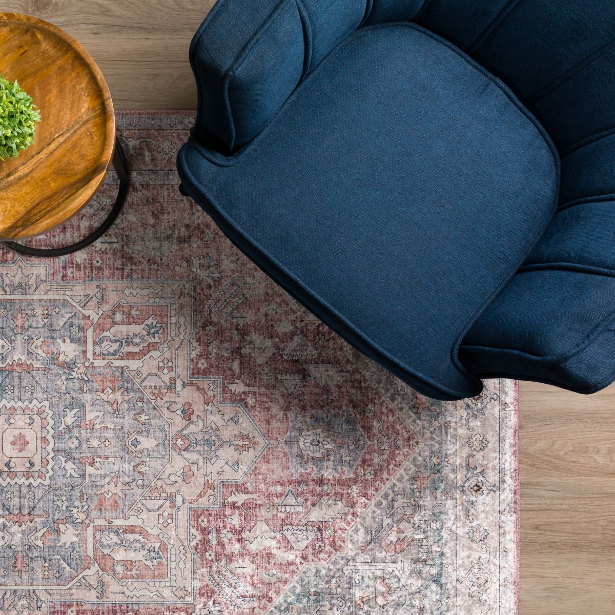 Vacuum rugs regularly. Set the vacuum height gauge to its highest setting, as some powerful vacuums may damage the pile, bound edges or corners of your rug. Do not pull loose yarns; trim with scissors. Frequent vacuuming will aid in eliminating excess loose fibers. The shedding will diminish with regular wear and vacuuming. Blot spills immediately. Spot clean with mild soap and water.