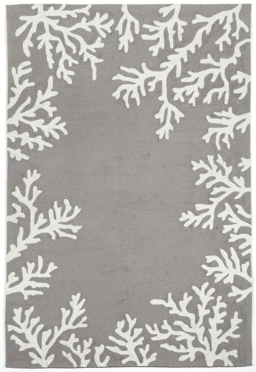 The Coral Border transitional decorative area rug features a neutral silvery grey background with a white coral motif border. A classic, subtle tropical motif, this coastal rug will effortlessly compliment any space inside or outside your home.