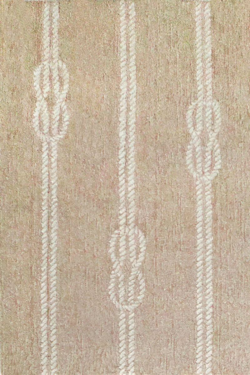 The Ropes transitional decorative area rug features a neutral beige background with a simple white rope with a nautical knot detail. A classic sea inspired design will effortlessly compliment any space inside or outside your home.