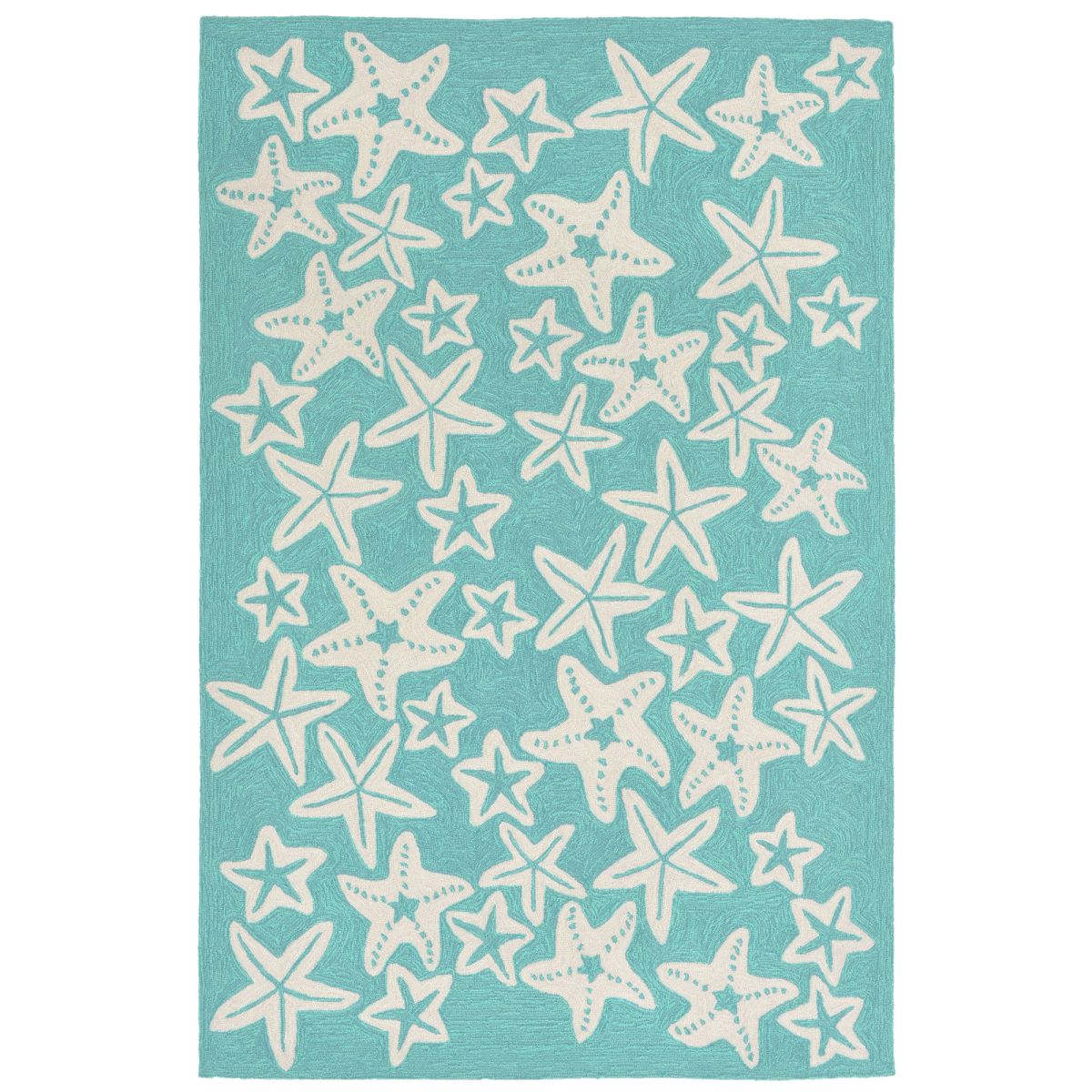 The Starfish transitional decorative area rug features an aqua blue background accented with stylized starfish outlined in white. Simple, tropical and fun, this coastal design will effortlessly complement any space inside or outside your home.