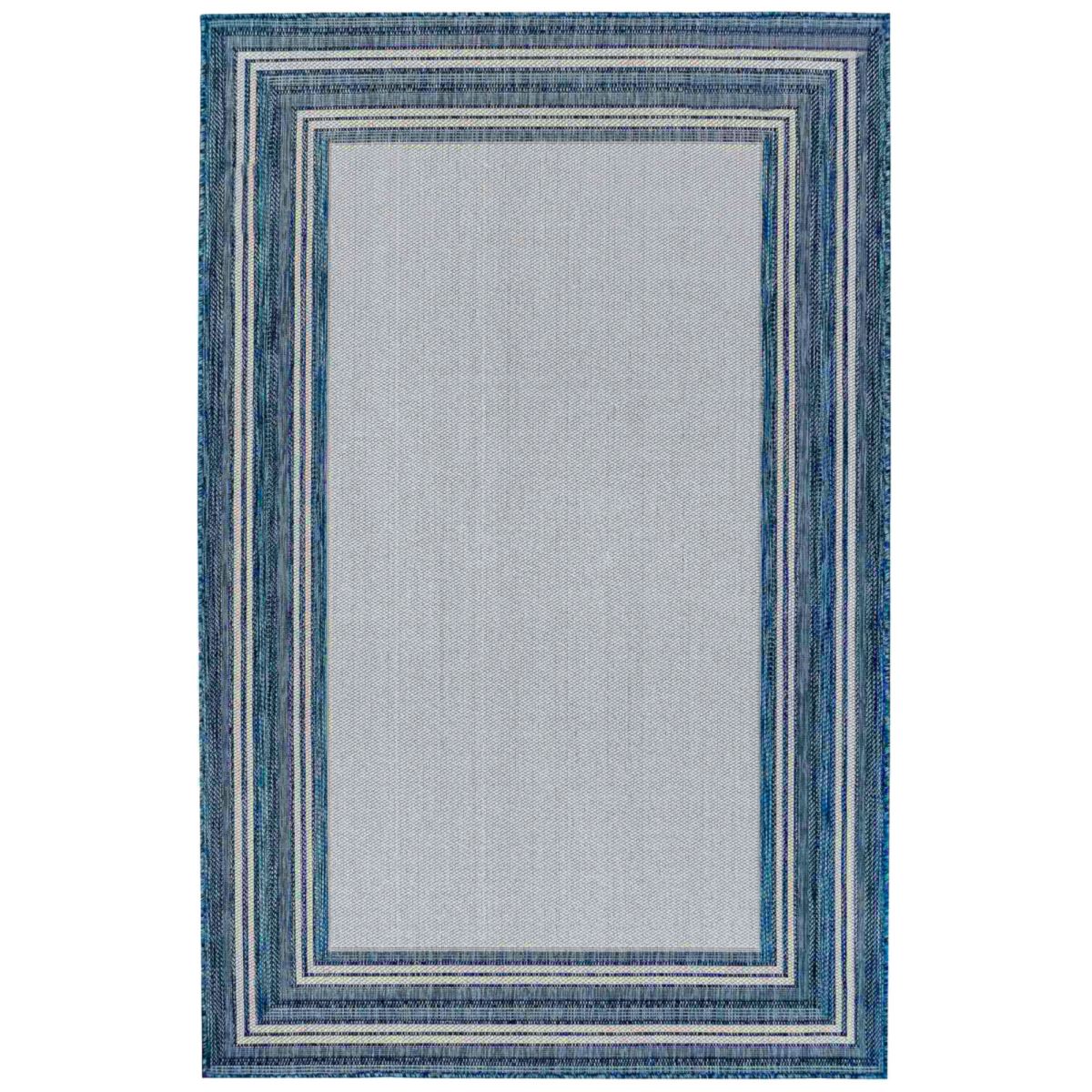 The Multi Border colorful traditional flatweave area rug features a solid light blue center accented by multiple borders in ivory, navy and blue hues to create a visually interesting pattern. This design is perfect for welcoming guests in your entryway, living room or as a stylish detail on your outdoor patio or deck.
