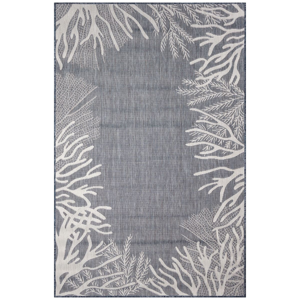 The Reef Border transitional decorative coastal inspired flatweave area rug features a detailed ivory coral reef border design on a solid background.
