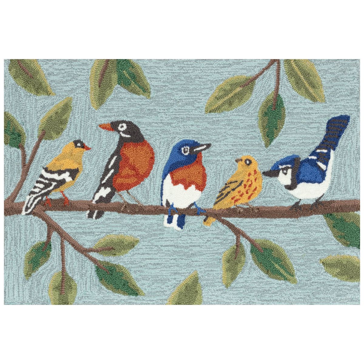 The Birds On A Branch doormat features a picturesque scene of chirping song birds perched on delicate tree branches with green leaves on a blue background.