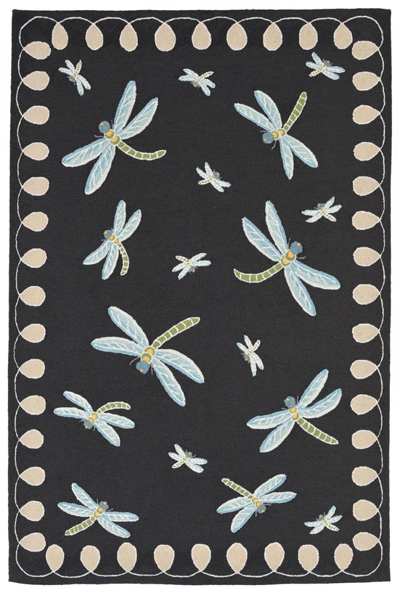 This decorative, whimsical, contemporary Dragonfly mat, designed with a border, features richly blended colors adding vitality and sophistication to playful novelty designs, in black.