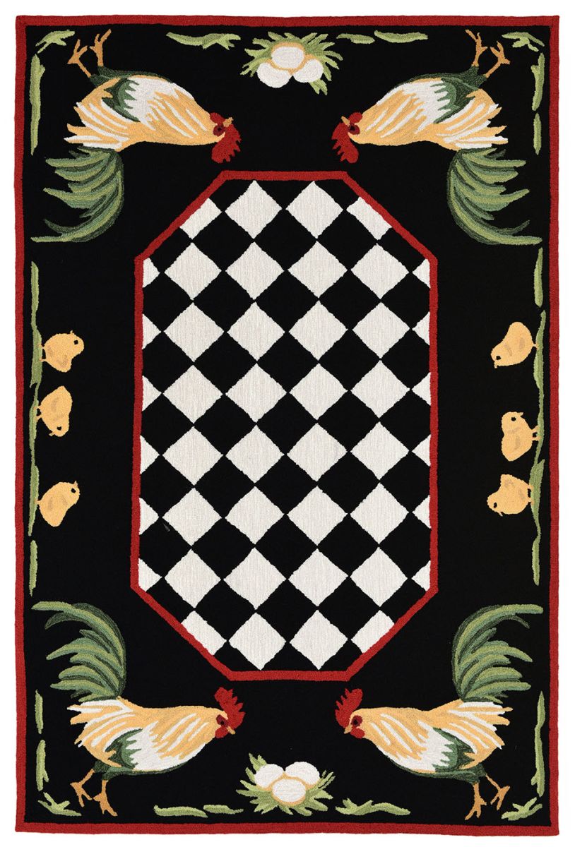 The Roosters decorative area rug features yellow and white roosters and yellow chickadee border with a black and white checkerboard center outlined in red on a solid black background. This colorful rug adds a country vibe to your indoor or outdoor space.
