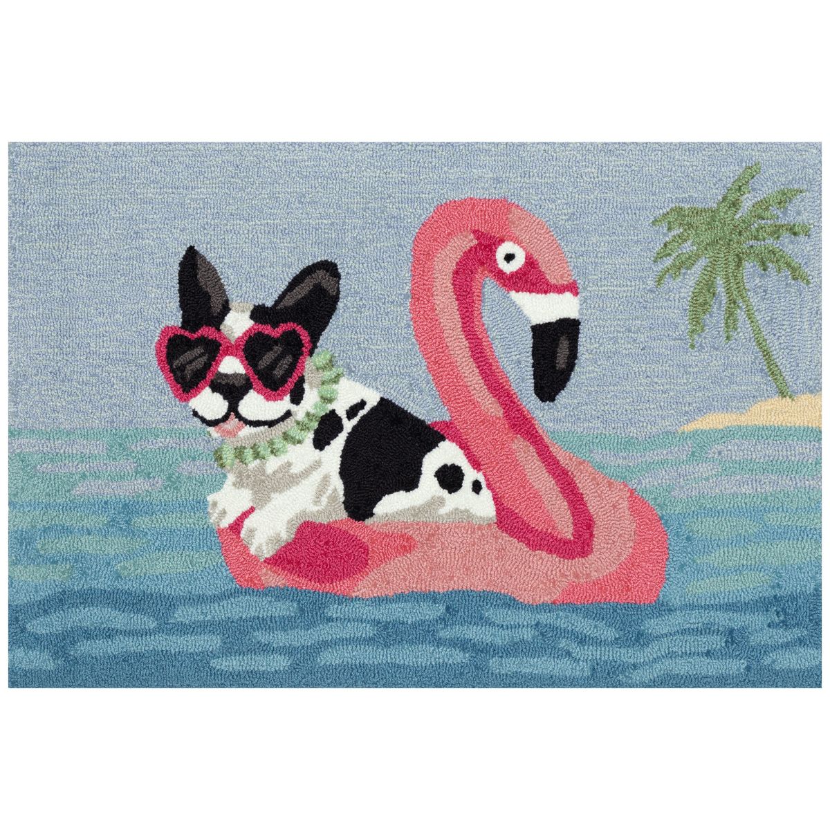 The Sit Stay Vacay accent mat features a tropical scene of a black and white dog on a flamingo float drifting off an island in the ocean.