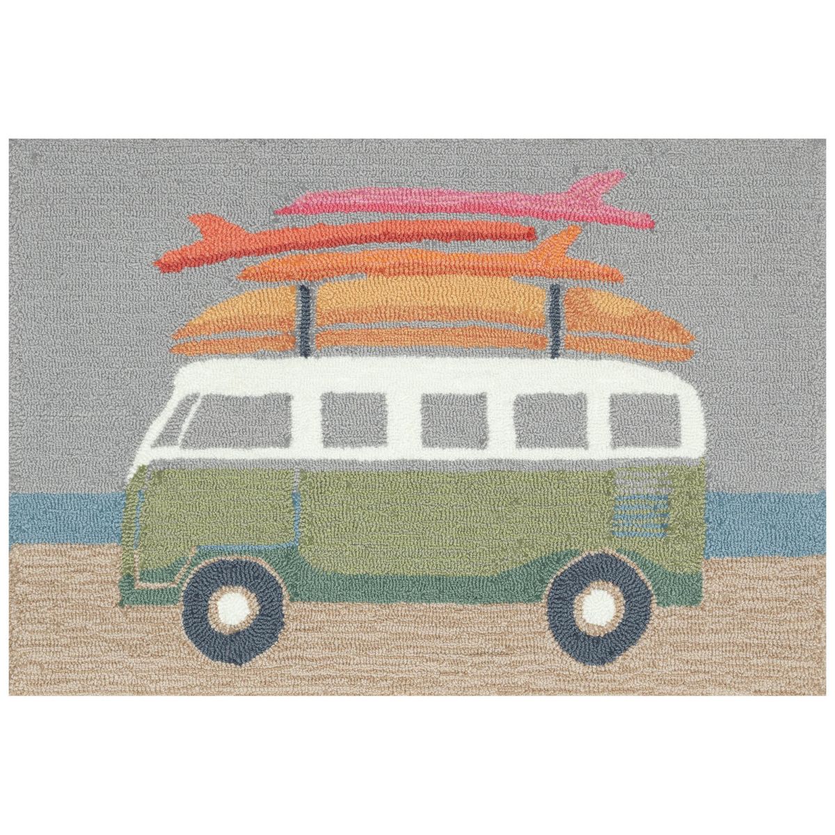 The Van Life doormat features an aqua and white van with bright yellow and orange surfboards atop at the beach against an ocean background.