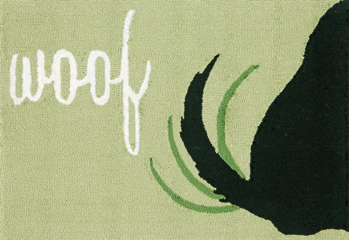The decorative, novelty, transitional Woof mat features a silhouette of the back end of a black dog with a wagging tail on a colorful pale green background. This playful design adds a touch of whimsy to your indoor and outdoor space.