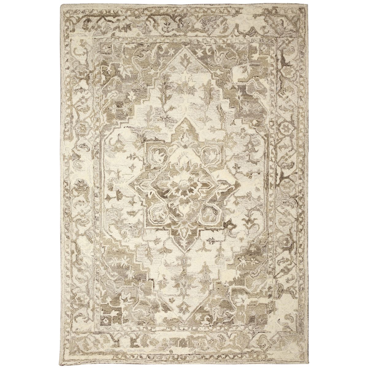 This area rug is complete with ornate detailing that fills the entire surface with a subtle, neutral coloring that is anything but dull. An eight point medallion fills the center and is enclosed in an oversized diamond to create a subtle focal point in the design. This combination of pattern and color come together to deliver a refined but casual style to your home.