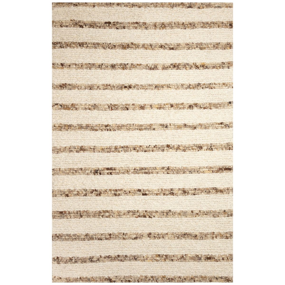 The Stripe area rug features a rustic thick textured wool presence in light natural with dark natural stripe accents for a cozy cabin feel and a versatile addition to any indoor decor.