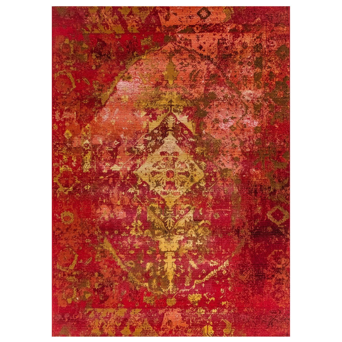 The Kermin decorative flatweave area rug takes inspiration from the Kermin design, a classically traditional design made special and unique with an abstract twist for a finish results in a stunning watercolor effect. It's rich, colorful saturated red color accented with gold and subtle black beautifully showcases the traditional design, while the bold palette adds glamour and drama to any decor inside or outside your home.