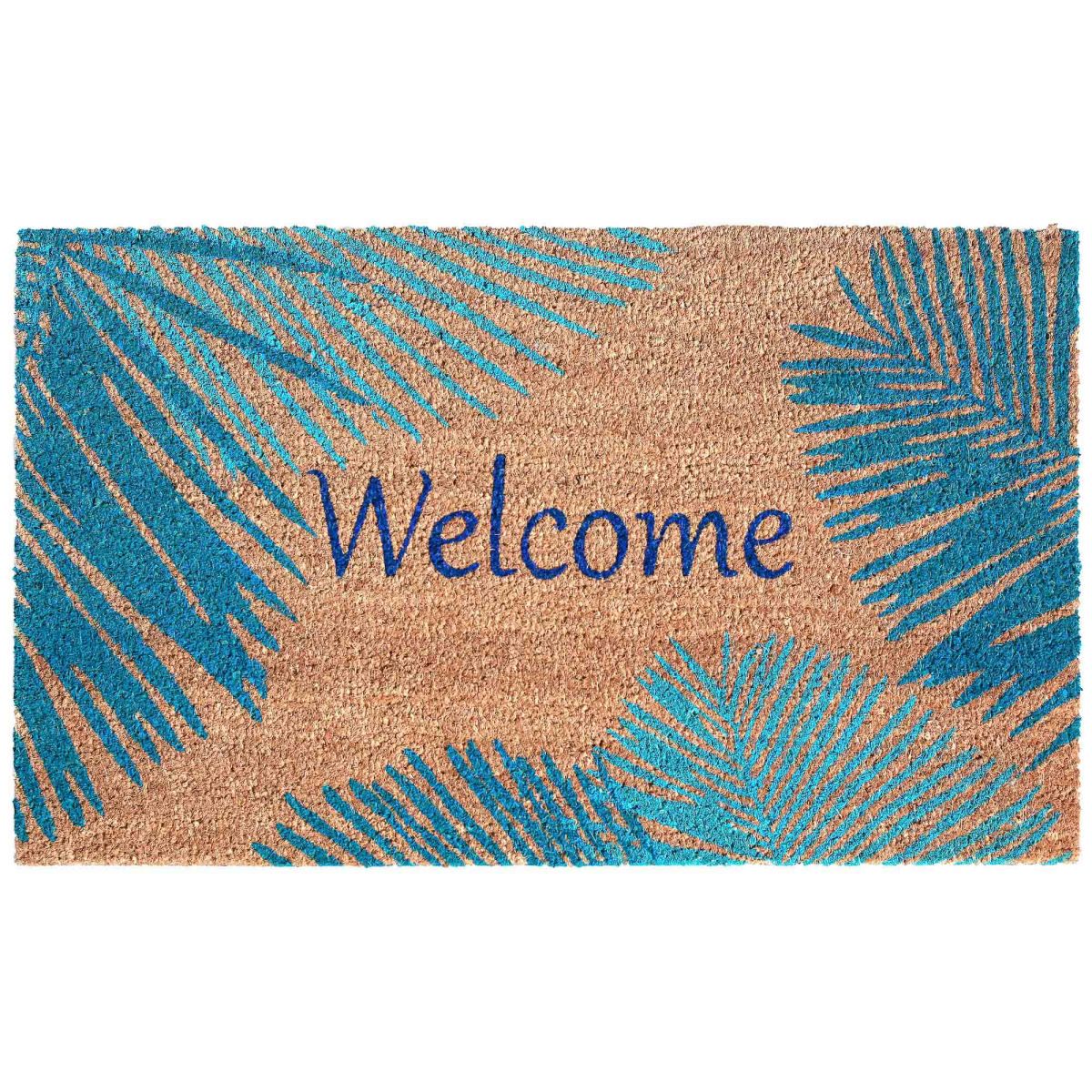The Palm Border mat features a blue tropical leaf border design with a with a center welcome message written in navy on a natural background.