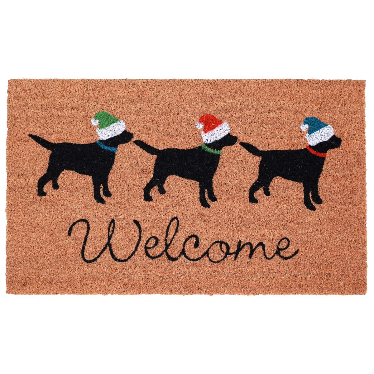 The Three Dogs Welcome novelty mat features three black labs each with different colorful collars and Santa hats on a natural background.