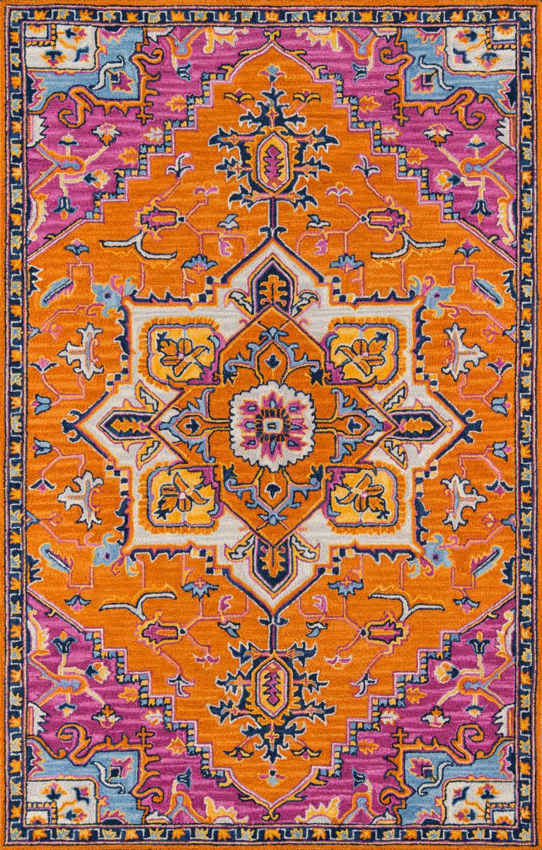 The saturated shades of this decorative area rug reinvent the classic Persian carpet in a vivid color palette. The captivating assortment offers a modern interpretation of traditional rug motifs, as vibrant pink, orange, blue and yellow tones form flowers, vines, palmettes and medallions in colors beautiful and bold. Hand tufted from 100% natural wool, each floorcovering makes a dramatic design statement as a focal point on floors throughout the home.