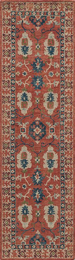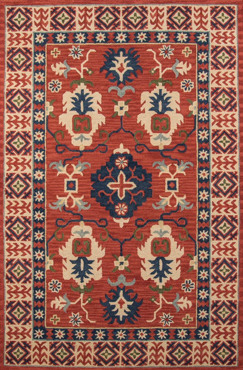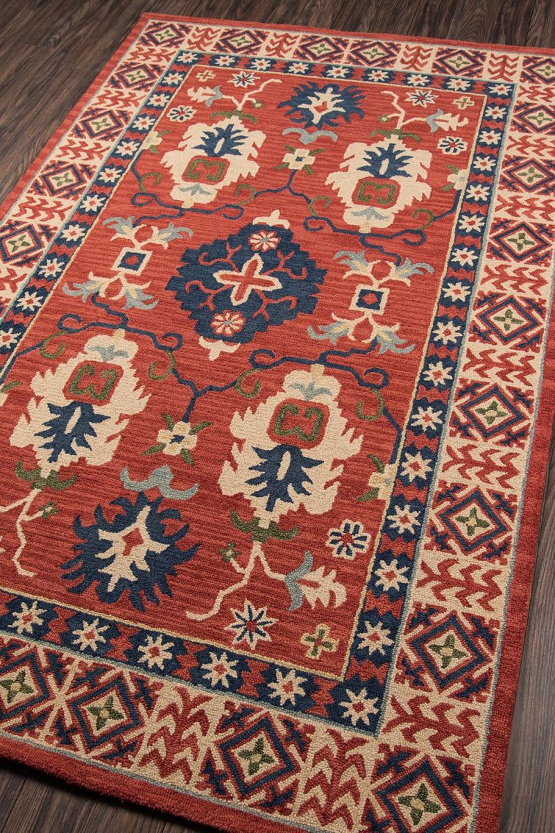 The graphic global designs of this traditional area rug are reminiscent of roads less travelled. Intricate Kazak rug motifs, including geometric patterns and repeating floral fields, are depicted in desert-inspired shades of warm red, gold, burnt sienna and sky blue. Natural 100% wool fibers and hand-tufted construction reflect the rugged sensibilities of each rug’s nomadic design, while a washed finish gives the rustic rug a refined hand.