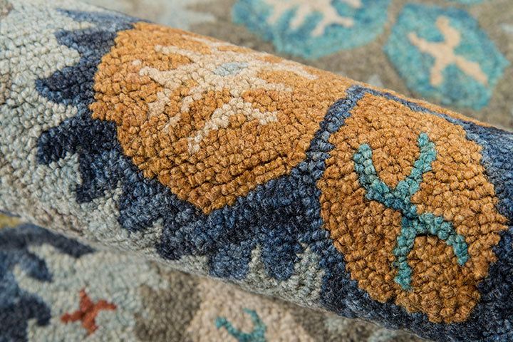 The graphic global designs of this traditional area rug are reminiscent of roads less travelled. Intricate Kazak rug motifs, including geometric patterns and repeating floral fields, are depicted in desert-inspired shades of warm red, gold, burnt sienna and sky blue. Natural 100% wool fibers and hand-tufted construction reflect the rugged sensibilities of each rug’s nomadic design, while a washed finish gives the rustic rug a refined hand.