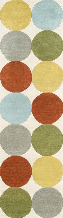 The graphic design of this modern area rug adds contemporary flair to floors throughout the home. Captured in a spectrum of vivid shades, polka dots, chevron stripes, triangulated patterns and checkerboard prints are perfect for layering above carpet or hard surfaces. Hand tufted from natural wool fibers, this decorative area rug assortment emanates fun with its oversized geometric arrangements and vibrant splashes of color.
