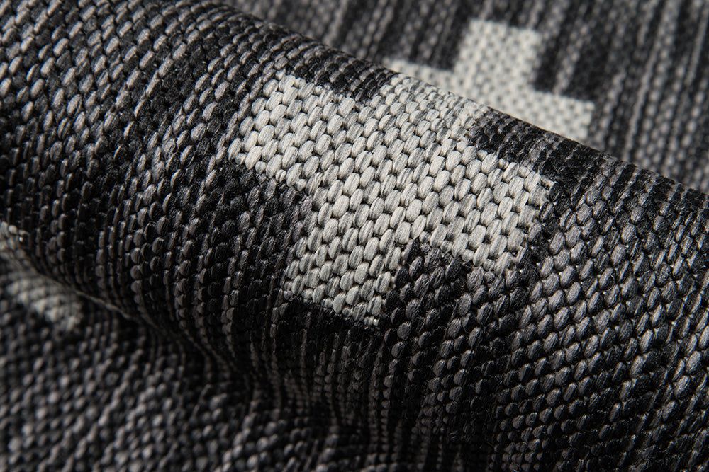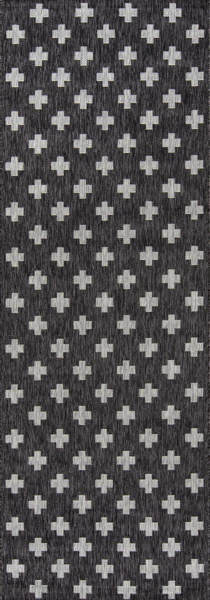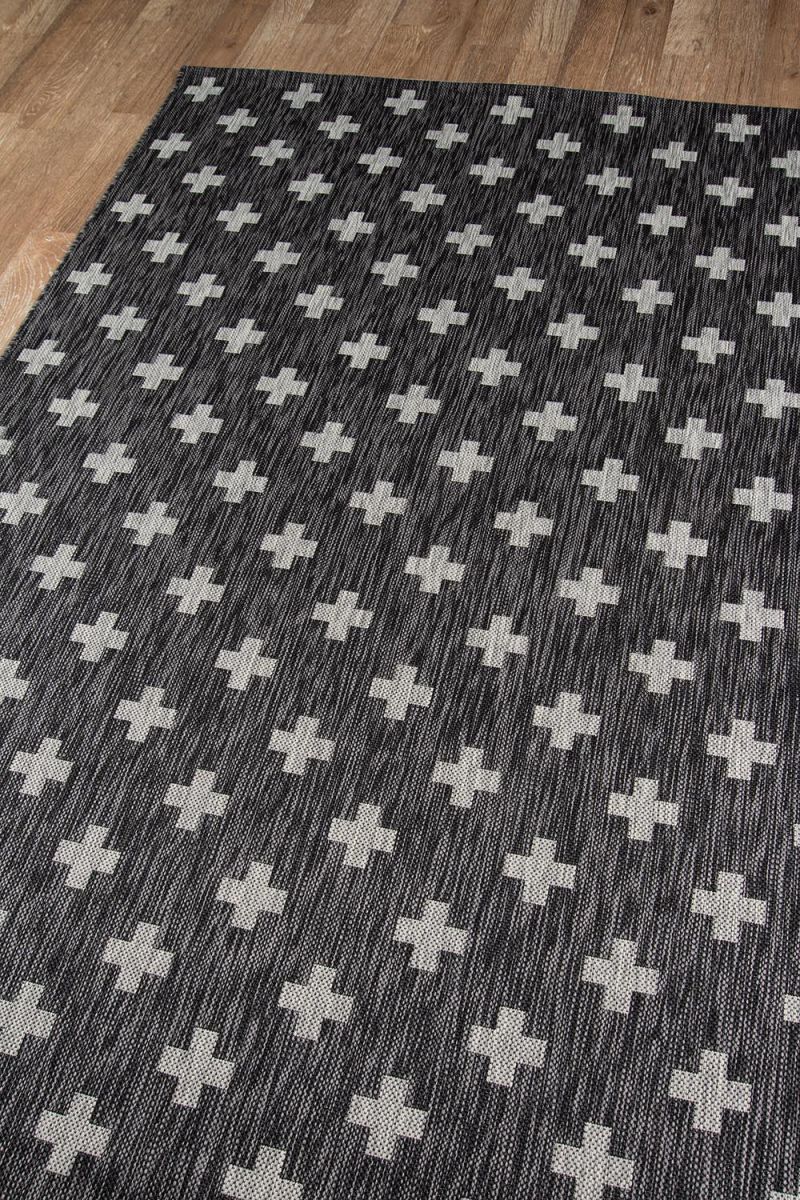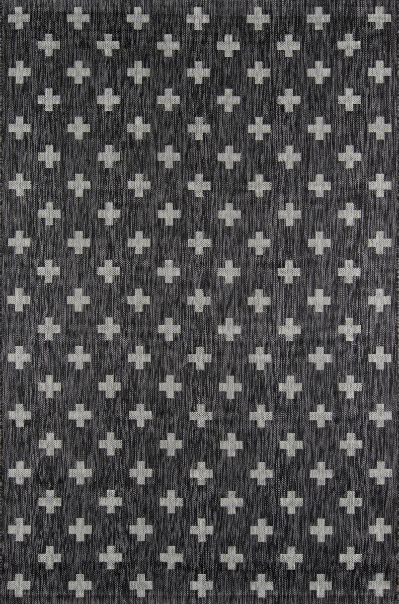 All-weather textiles get the graphic treatment in the all-over pattern of this indoor/outdoor area rug. The geometric print is a striking repeat of light grey crosses that cover the black background in shapes that recall the Romanesque cutouts of classical Italian architecture. Resilient polypropylene fibers are stain, heat and UV-resistant, retaining their color and texture throughout consistent exposure to the elements.
