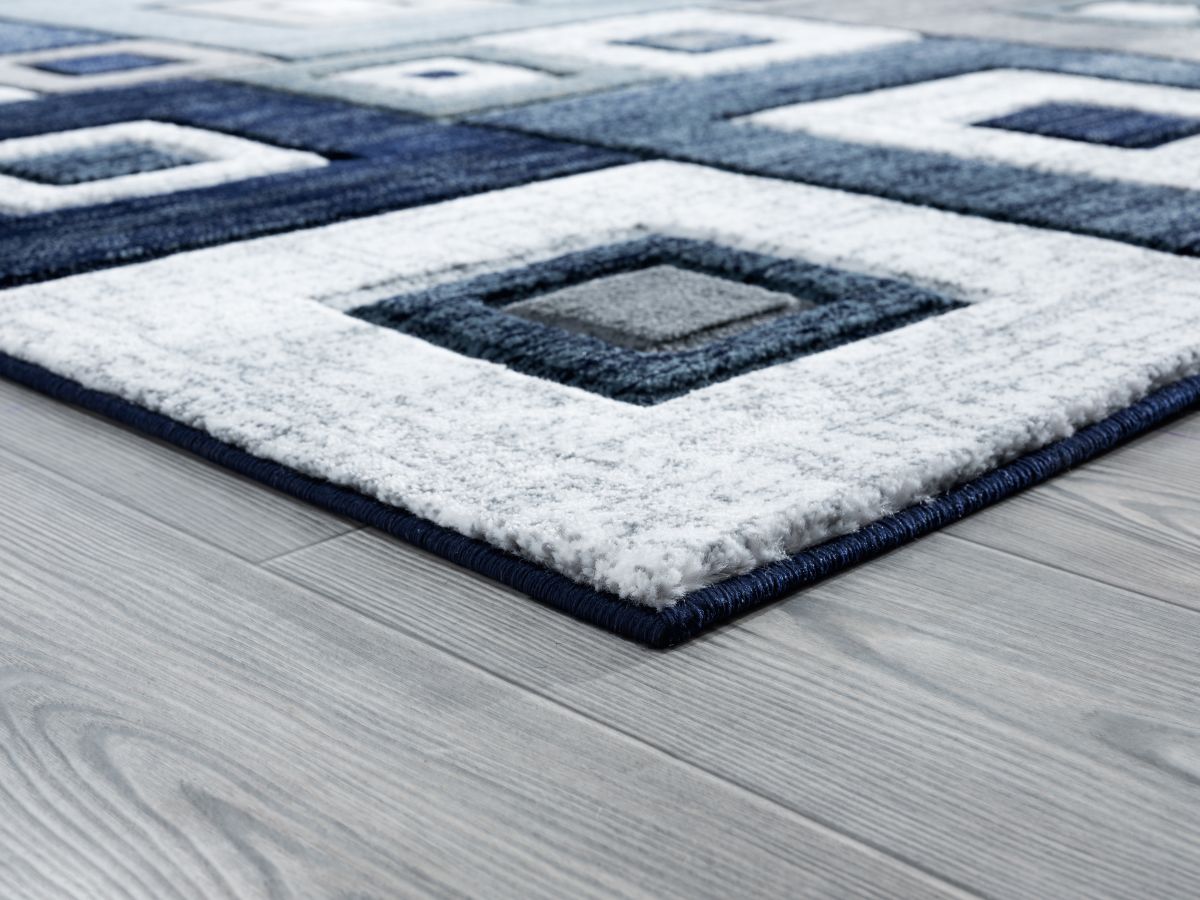 Add this fashionable and contemporary rug into your space for a modern look. This modish piece has geometric blocks with eye-catching colors of navy blue, pure white and smoke grey that will create the perfect atmosphere within your home décor. This machine-made rug has a hand carved design and is stain and fade resistant for your lifestyle needs.