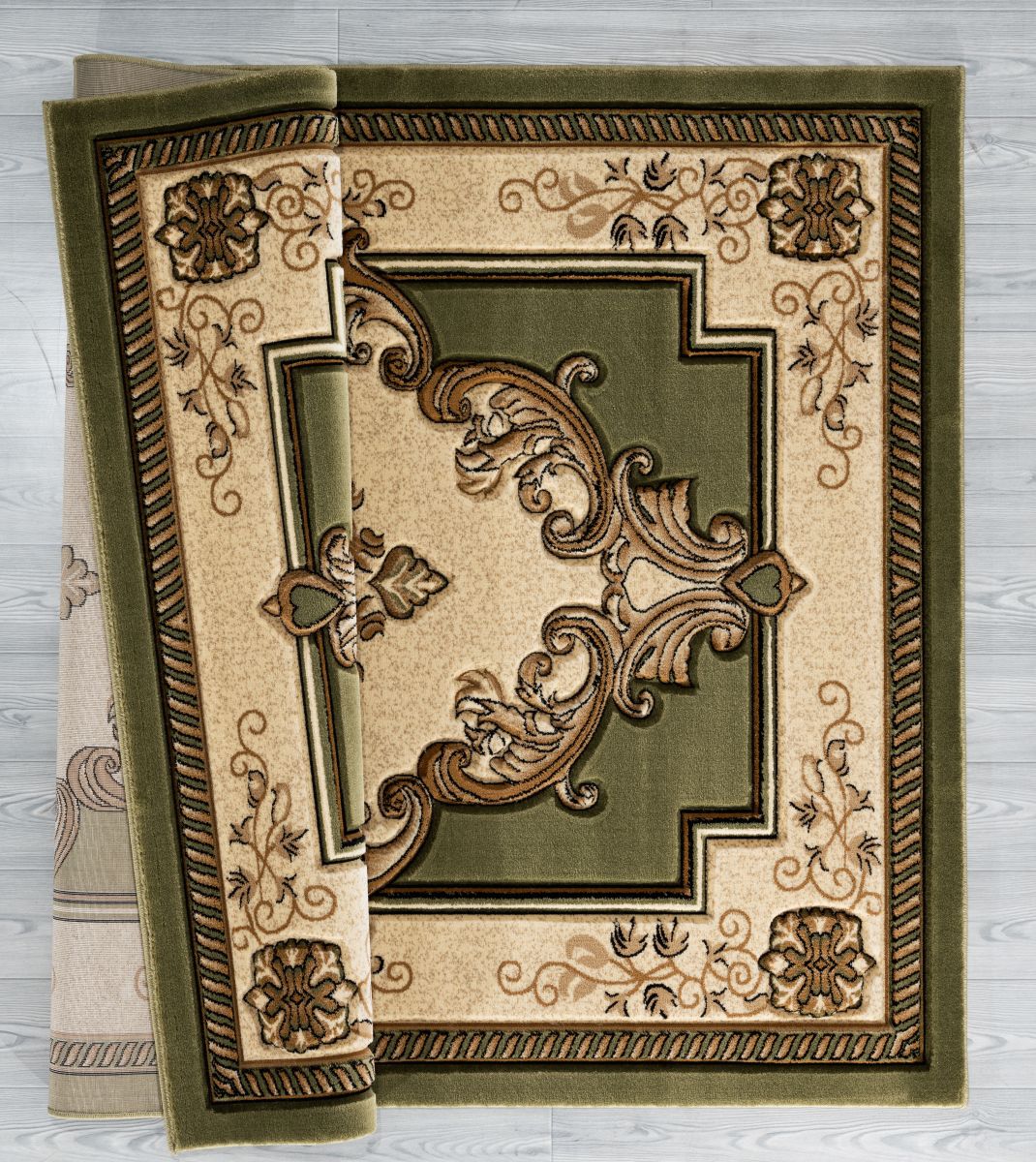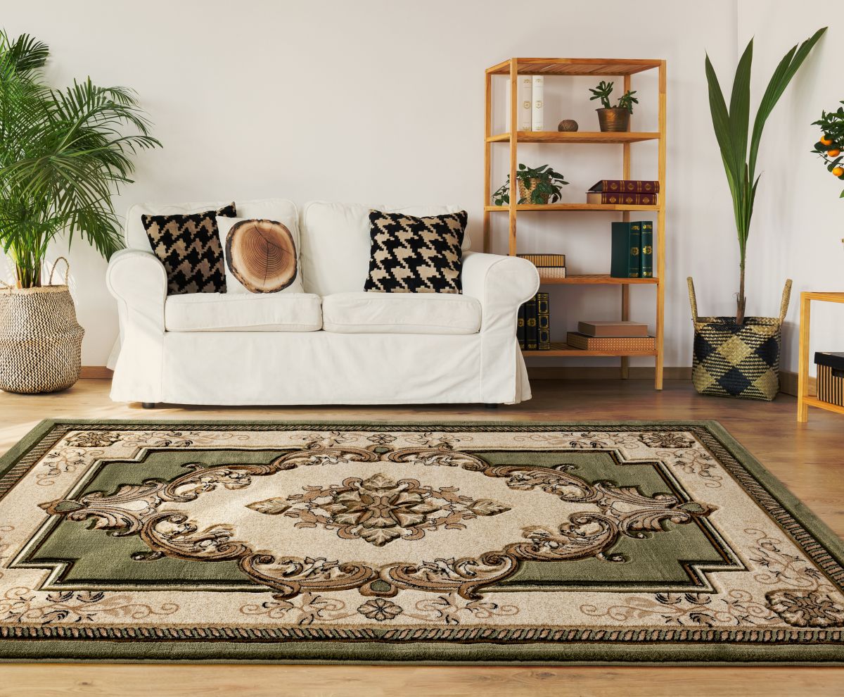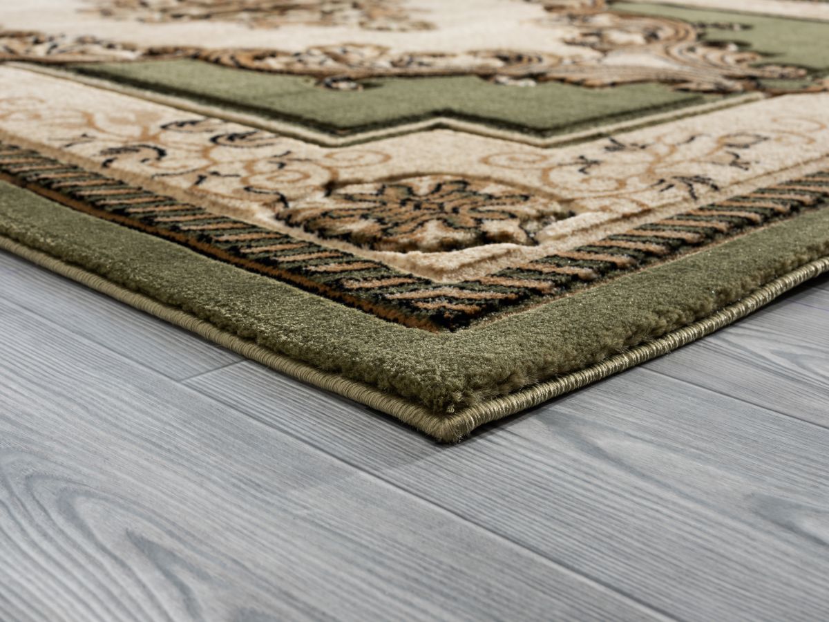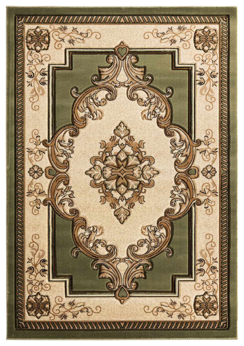 This royally grand area rug is a timeless piece to add to your interior design. This classic rug is filled with shades of olive green, gold and beige. Using an intricate border design and a large medallion in the middle, this floor covering will be the highlight of your room décor. This machine-made rug has a hand carved design and is stain and fade resistant for your lifestyle needs.