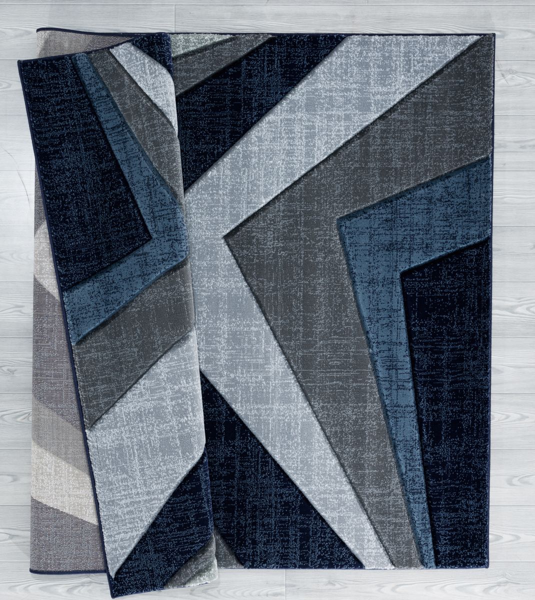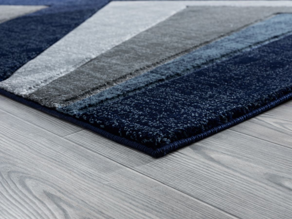 Add this fashionable and contemporary rug into your space for a modern look. This geometric rug contains shades of grey with accent colors of navy blue and denim blue that is sure to make an impact in your living space. This machine-made rug has a hand carved design and is stain and fade resistant for your lifestyle needs.
