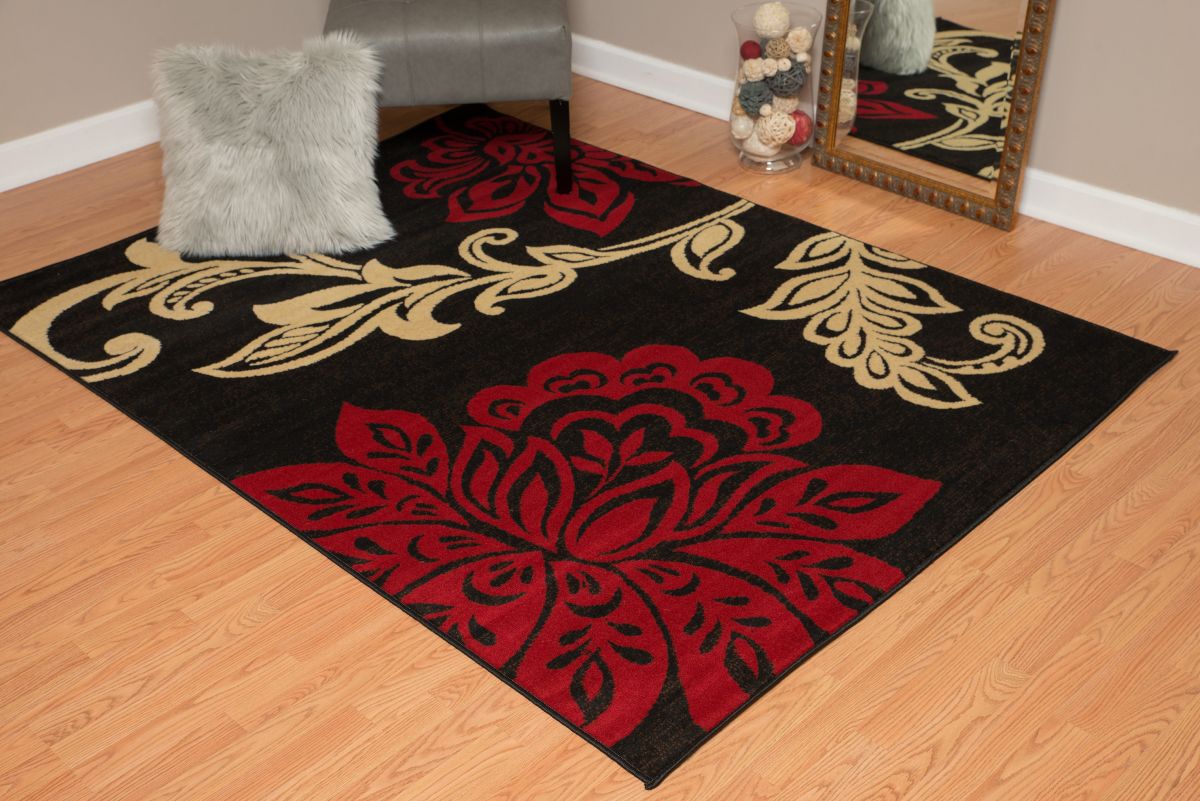 This contemporary rug design is inspired from enchanted botanical gardens. This marvelous rug will be the centerpiece of your room décor with its large flowers and hues of scarlet red and midnight black. Exquisite polypropylene machine-made rug with jute backing for long-lasting color and durability.